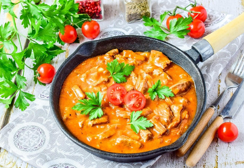 На изображении представлена аппетитная еда в сковороде - похоже на рагу или тушёное мясо с томатным соусом. Вокруг сковороды расположены помидоры, зелень и приборы для еды.