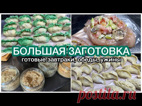 Изображение представляет собой коллаж из двух фотографий, на одной из которых изображены сыроежки и вареники, а на другой - начиненная курица и банки с крупами. Внизу изображения имеется текст "большая заготовка готовые завтраки, обеды, ужины" на фоне сайта "postila.ru".