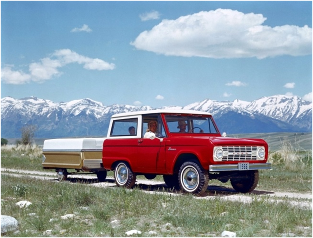 На фотографии изображен красный винтажный пикап с открытым кузовом, на котором находится небольшая прицепная тележка. В кабине пикапа видны два человека. Автомобиль припаркован на фоне горного пейзажа с заснеженными вершинами.