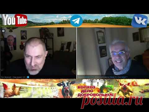 Скриншот видеоконференции с двумя мужчинами, с логотипами YouTube и VK в углах и текстом на русском языке в нижней части изображения.