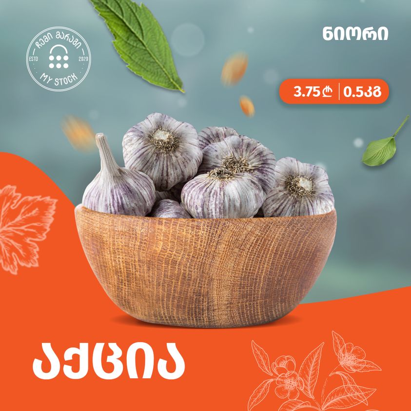 На изображении чеснок в деревянной миске на оранжевом фоне с листьями в воздухе и грузинским текстом, указывающим на продукт или бренд.