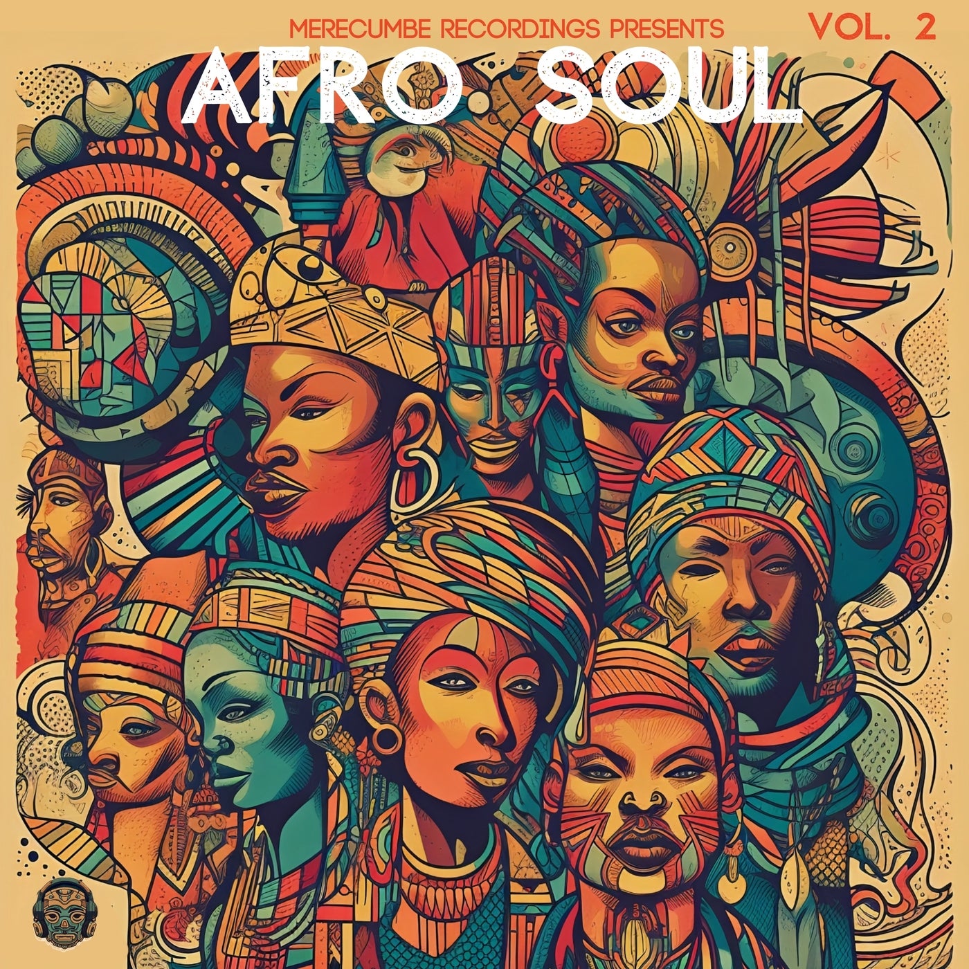 Изображение обложки альбома с яркими и цветными африканскими мотивами. На нем изображены стилизованные лица людей с примесью элементов африканской культуры. В верхней части есть надпись "AFRO SOUL", а в нижней части - "Merecumbe Recordings Presents VOL. 2".