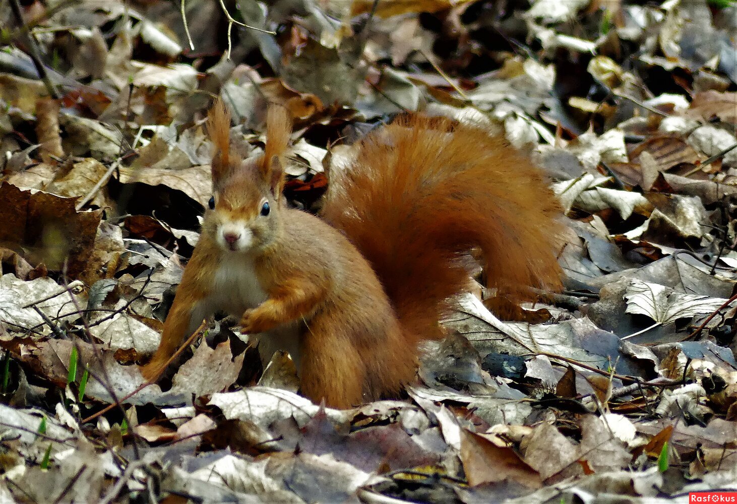 На фотографии изображена бурая белка в естественной среде обитания. Она стоит среди опавших листьев, что делает её окрас едва заметным среди осеннего лесного подстилки.