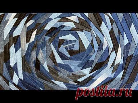 Абстрактное изображение с вихревым узором, напоминающее коллаж из кусочков ткани в различных оттенках синего цвета.
