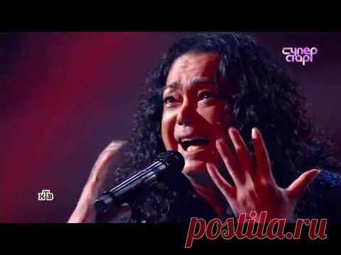 На изображении женщина выступает с микрофоном на сцене. Она кажется очень эмоциональной и выражает сильные чувства через своё исполнение. Окружение указывает на то, что это кадр с телевизионного выступления или концерта.