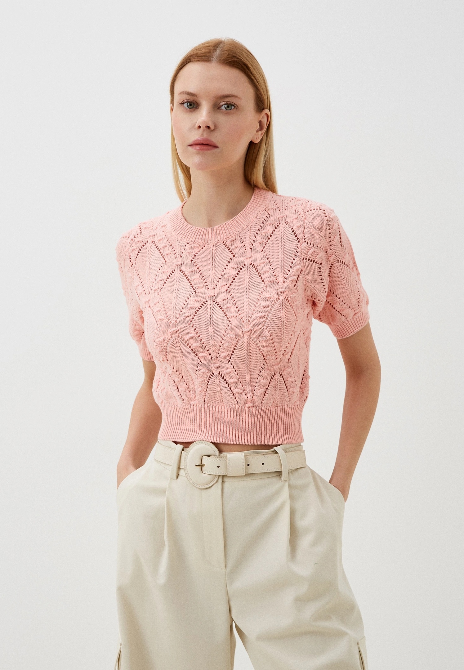 Женщина в розовом вязаном свитере и бежевых брюках. Она стоит прямо, смотрит в камеру и серьезно выглядит. Фон нейтральный, белый.