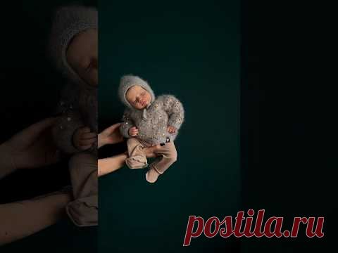 На изображении виден младенец, одетый в милый зимний наряд, который включает в себя шапочку и теплый комбинезон. Ребенок лежит на руках у взрослого, на фоне темно-зеленой стены.