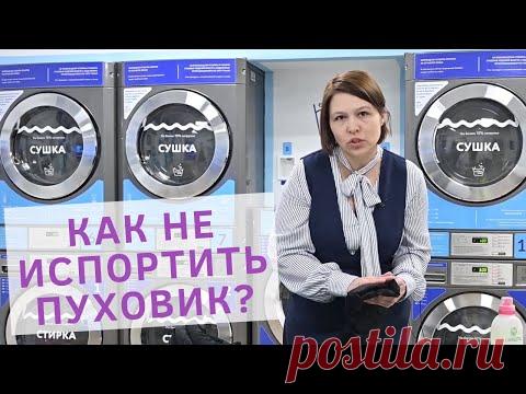 Женщина стоит на фоне стиральных и сушильных машин в прачечной. На картинке есть текст: "Как не испортить пуховик?".