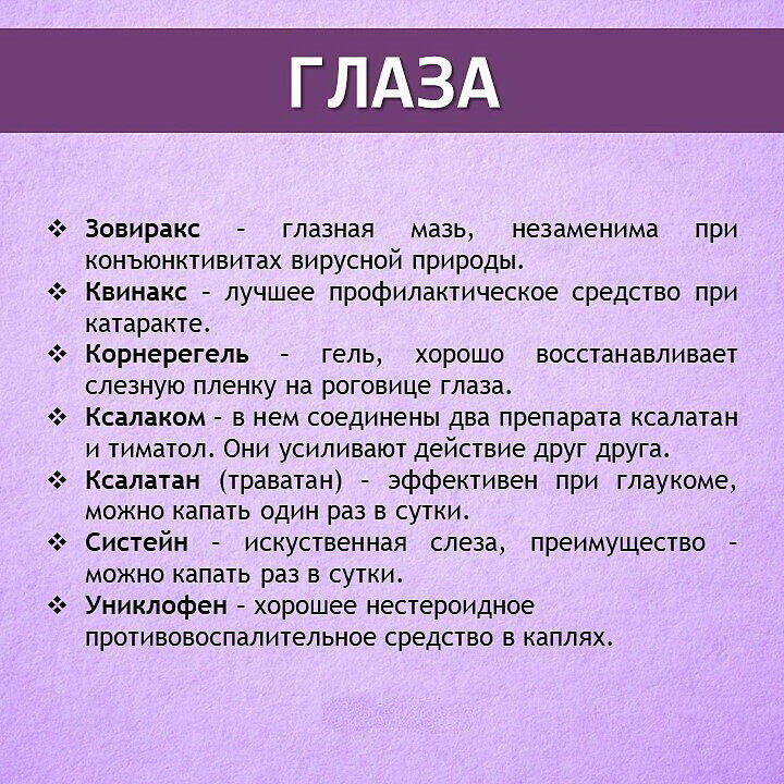 Изображение с текстом на русском языке, перечисляющим различные препараты и средства для глаз. Название "ГЛАЗА" указано вверху. Каждая позиция включает название продукта и его краткое описание или предназначение, такие как "Зовиракс - глазная мазь", "Квинакс - лучшее профилактическое средство при катаракте" и другие.
