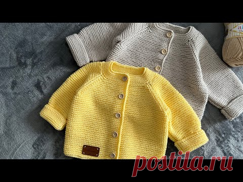 На изображении два вязаных детских кардигана лежат на сером фоне. Один кардиган жёлтого цвета, а другой имеет цвет натурального бежевого льна. Оба кардигана с длинными рукавами и застёжками на пуговицы.