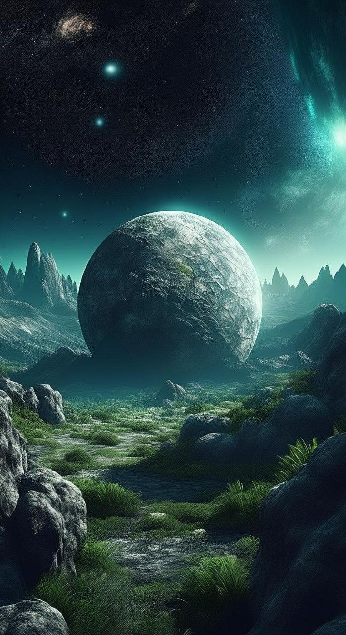 Изображение фантастического пейзажа с видом на гигантскую планету на небе над зеленым, травянистым ландшафтом при ночном освещении. На небе заметны звезды и туманности, создавая ощущение нахождения на другой планете или в другом мире.