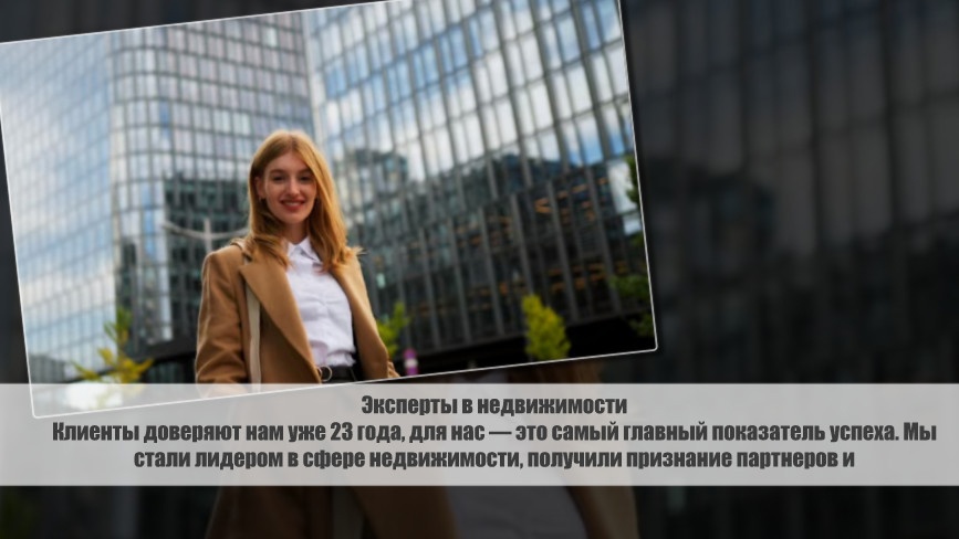 На изображении женщина в бежевом пиджаке улыбается, стоя перед зданиями с зеркальными стеклами. Внизу находится текст на русском языке, рекламирующий достижения фирмы в сфере недвижимости.