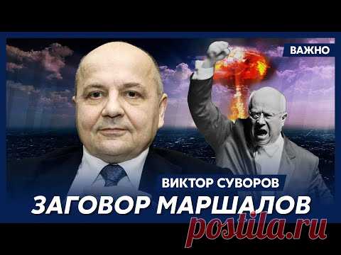 На изображении представлены две фигуры мужчин на фоне неба с облаками. Слева расположен портрет мужчины в костюме и галстуке, а справа наложенное изображение кричащего мужчины, поднявшего правую руку с пламенем вместо руки. Надписи на русском языке указывают на имя «Виктор Суворов» и что-то, озаглавленное как «ЗАГОВОР МАРШАЛОВ». Внизу изображения находится логотип «постила.ru», предположительно, указывающий на источник изображения или ассоциированный веб-сайт.