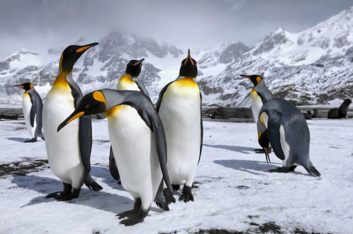 Группа королевских пингвинов (Aptenodytes patagonicus) в снежном ландшафте с горами в фоне.