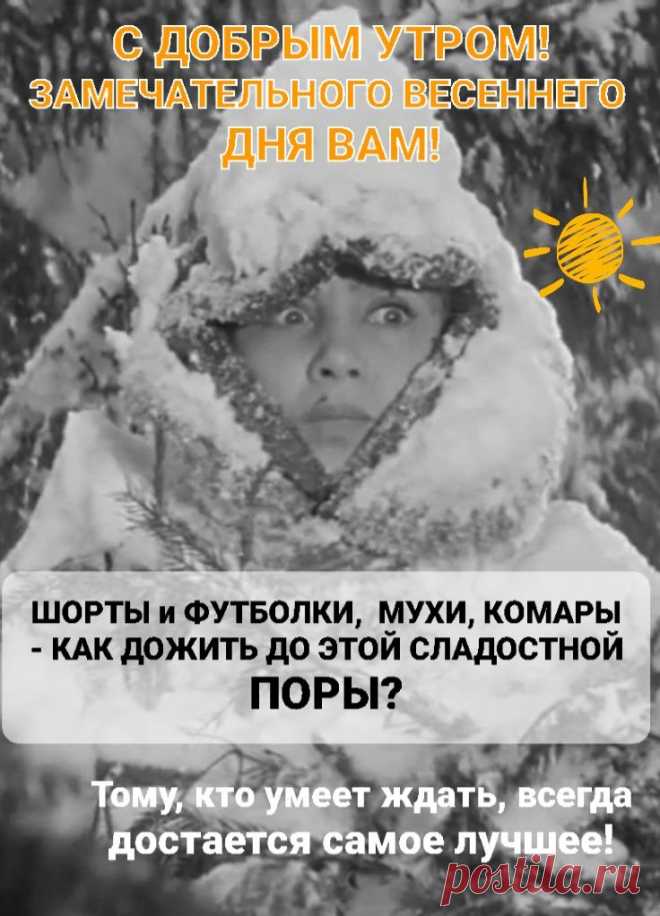 На изображении человек в зимней одежде, лицо окружено меховым воротником, и на лице выражение удивления или шока. Верхняя часть изображения имеет текст на русском языке, который гласит: "С ДОБРЫМ УТРОМ! ЗАМЕЧАТЕЛЬНОГО ВЕСЕННЕГО ДНЯ ВАМ!" И ниже есть еще текст, вероятно, связанный с юмором или пожеланиями. Изображение стилизовано под черно-белое фото и имеет ретро вайб.