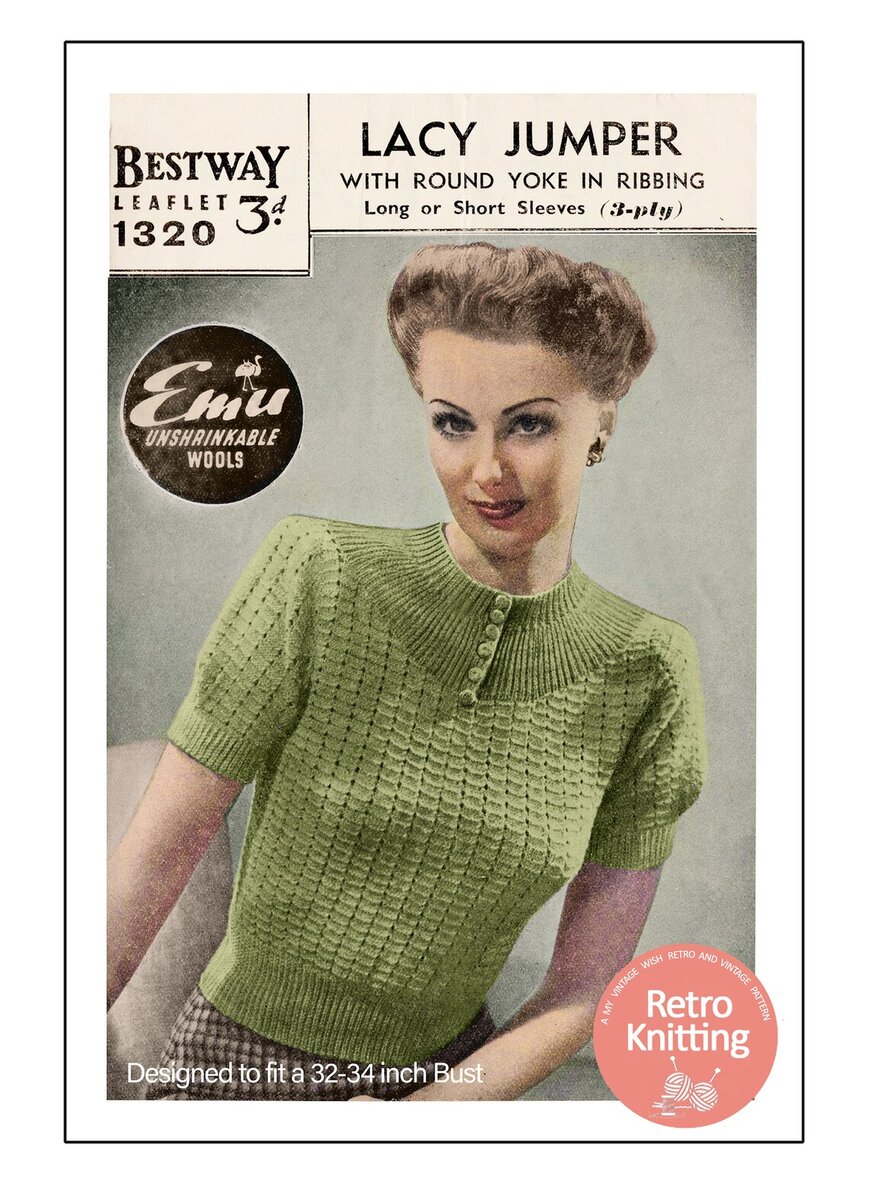 Рекламный листок винтажного журнала по вязанию с изображением женщины в зеленом вязаном джемпере. На обложке название "LACY JUMPER WITH ROUND YOKE IN RIBBING", а также указаны размеры и бренд пряжи "Emu UNSHRINKABLE WOOLS".
