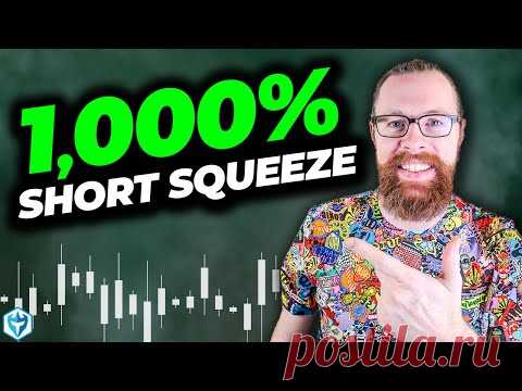 На изображении мужчина с бородой и в очках, указывающий на текст "1,000% SHORT SQUEEZE" с графиком цен акций в фоне. Он улыбается и носит цветочную рубашку. В левом верхнем углу находится логотип с буквой "V" внутри щита. В нижней части изображения есть ссылка "positula.ru".