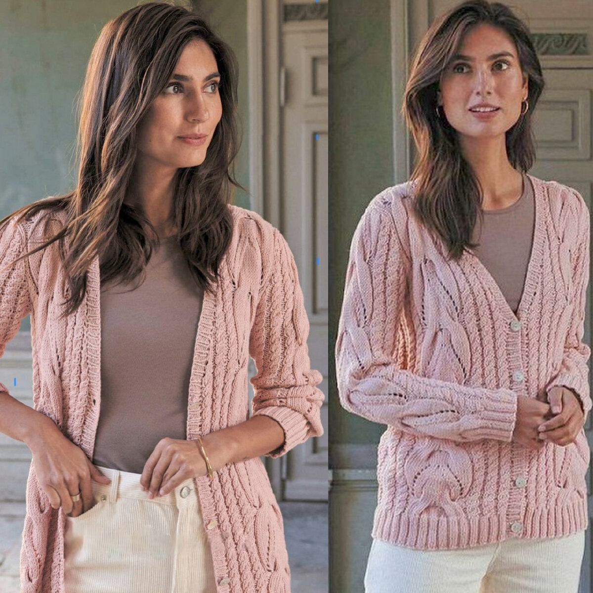 На изображении представлена женщина, одетая в розовый вязаный кардиган и светло-розовую футболку. У нее темные волосы и она позирует в полуповороте к камере. Фон изображения - интерьер комнаты.