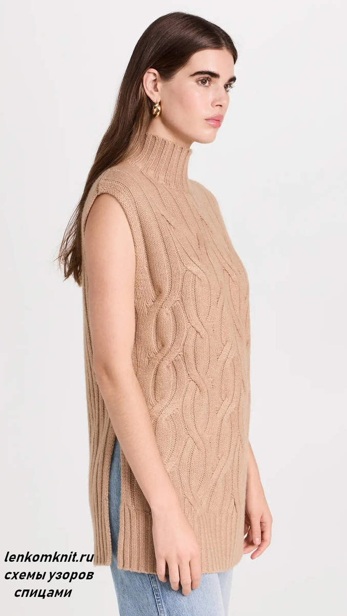 Женщина в светло-коричневом вязаном безрукавке с узором кос и джинсах. Позиция модели показывает одежду в профиль. У неё длинные волосы, укладка строгая, а на ушах крупные серьги.