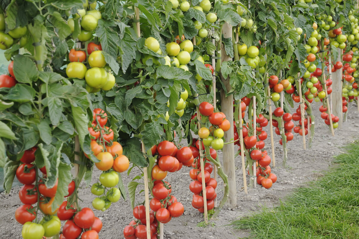 Ряды помидоров выращиваются в открытом грунте. На растениях видно множество зеленых и спелых красных плодов помидоров, подвязанных к вертикальным опорам.