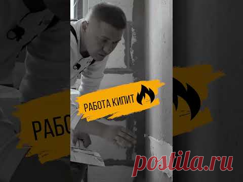 На изображении мужчина в форме, возможно, работник, выполняет какую-то задачу со стеной или колонной. Элементы дизайна изображения, такие как цветовые вкрапления и текст, указывают на то, что оно может быть обложкой журнала или рекламой. Надпись на русском "РАБОТА КИПИТ" подразумевает, что изображена сцена активной работы.