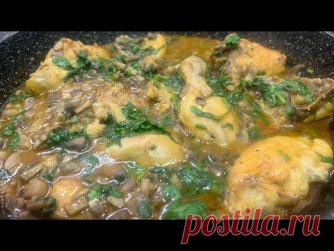 На изображении видно блюдо, которое похоже на тушеное мясо с зеленью в соусе. Возможно, это курица или индейка, тушеная с луком, специями и мелко нарезанной зеленью, предположительно петрушкой или кинзой, подается горячей.