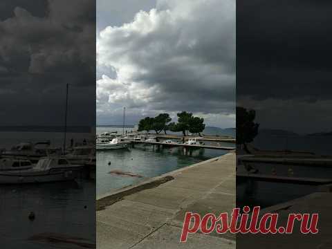 Темные облака нависают над морским портом, где пришвартованы лодки рядом с бетонной пристанью. На заднем плане видны зеленые деревья и причал. Погода кажется бурной из-за сгущающихся туч.