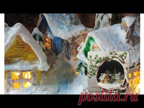 Зимняя деревянная миниатюрная деревушка с освещенными домиками, покрытыми искусственным снегом, создающим уютную атмосферу праздника.
