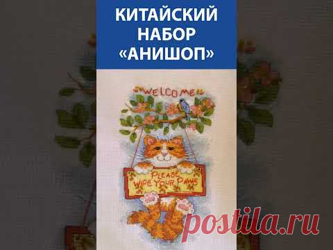 Китайский набор для вышивки с изображением оранжевого кота, держащего табличку с надписью "Welcome", оформленный цветами и узорами.