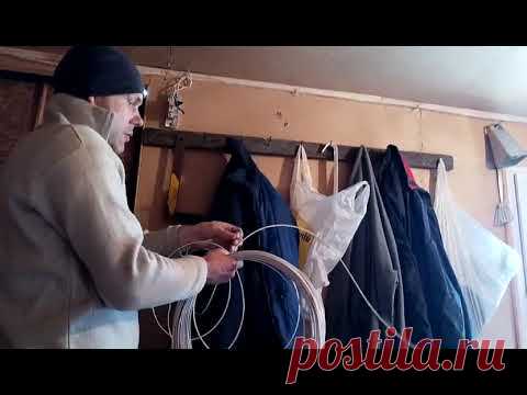 На фотографии мужчина в помещении, похожем на мастерскую или гараж, занимается какой-то работой с прозрачными пластиковыми трубками. На заднем плане висит верхняя одежда.
