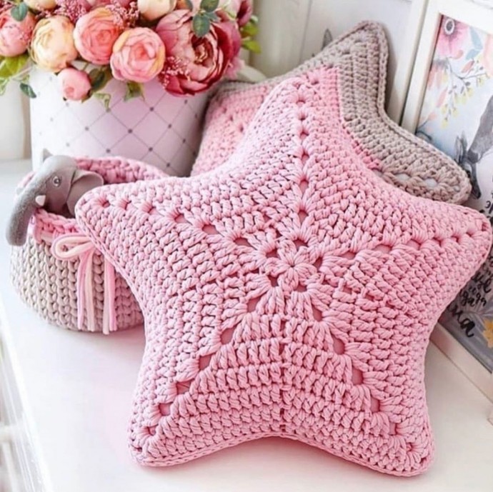 Розовая вязаная подушка в форме звезды рядом с другими вязаными изделиями и искусственными цветами