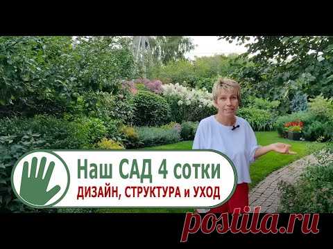 На изображении женщина стоит в саду. Вверху изображения расположен текст "Наш САД 4 сотки - дизайн, структура и уход" на русском языке, что предполагает обучающий или информационный контент о садоводстве.