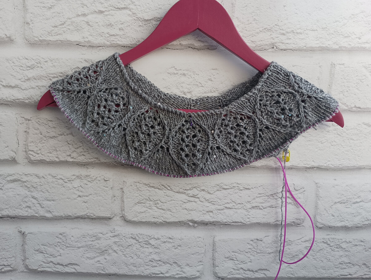 Серый вязаный изделие, похожее на начало пледа или шарфа, висит на красной вешалке против белой кирпичной стены. На изделии видны узоры, которые напоминают мотивы ажурного вязания.