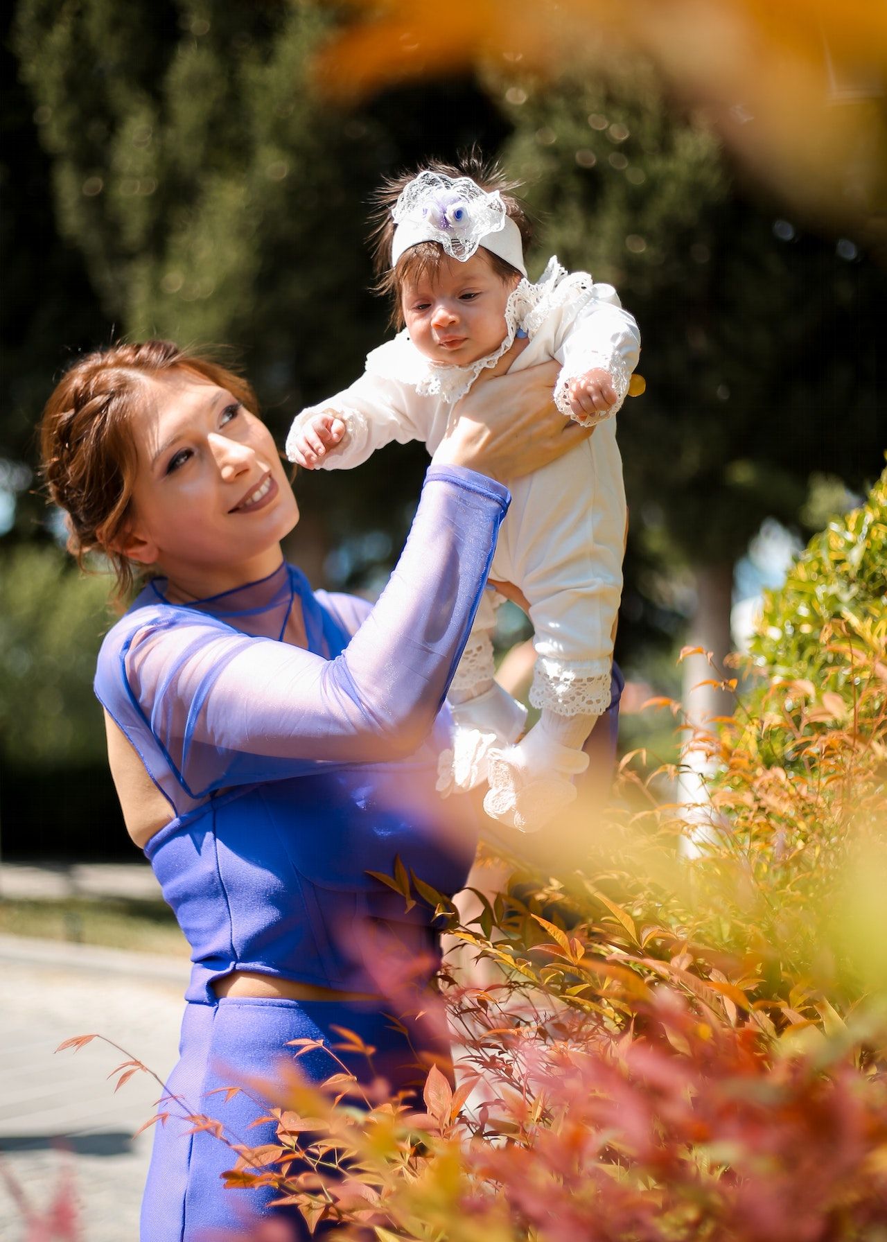 Женщина в синем платье держит на руках младенца в белом наряде на фоне зелёной растительности и яркого солнечного света.