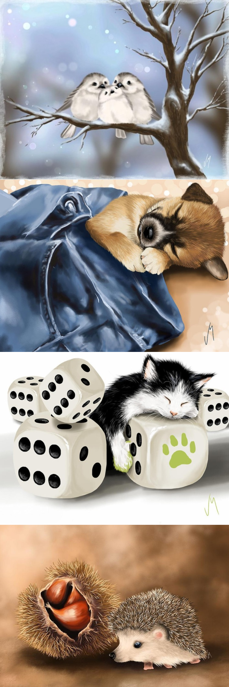 Коллаж изображений с милыми животными. В верхней части изображены три маленьких птицы, похожих на снегирей, сидящих на ветке дерева в зимнем лесу. В средней части лежит собака породы шиба-ину, укрытая синей тканью, кажется, что собака спит. В нижней части изображены игральные кости и спящий на них котенок с черно-белой шерстью. В самой нижней части коллажа находится ежик, рядом с которым лежит открытый каштан.