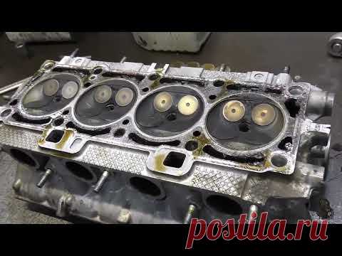 Открытая головка блока цилиндров двигателя, показывающая камеры сгорания и клапаны.