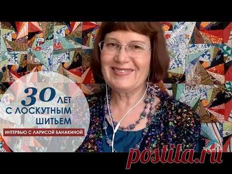 На изображении женщина с улыбкой носит очки и одета в кофту с цветочным принтом. Позади неё расположен квилт или пэчворк из разноцветной ткани. Надпись на изображении гласит: "30 лет с доскутным шитьём - интервью с Андреой Банксиной". Элементы дизайна и текст на изображении указывают на то, что это возможно обложка видео или анонс интервью.