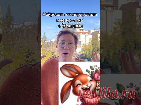 На фото изображена женщина, которая выглядит удивленной, и рядом с ней нарисованный кролик с тремя ушами. Дизайн напоминает мобильное приложение для изменения фотографий с использованием искусственного интеллекта. В заднем плане видно окно и растения внутри помещения.