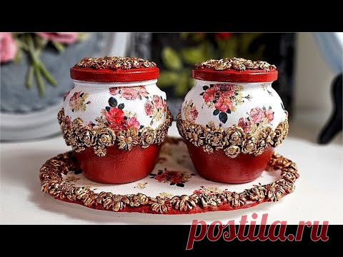 На изображении представлены два украшенных баночки для хранения, возможно для специй или других мелких предметов. Они расположены на подносе, который также украшен. Баночки и поднос имеют красную окраску с декоративным орнаментом в виде цветов и узоров. На заднем плане видна часть другого предмета, возможно, вазы.