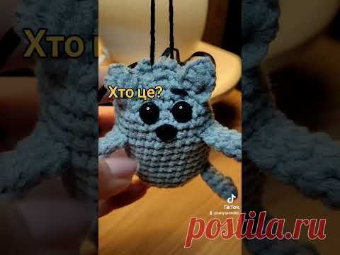 это вязаный амигуруми в форме серого кота с большими черными глазами, который висит на нитях. В верхней части изображения текст "Кто это?" на русском языке.