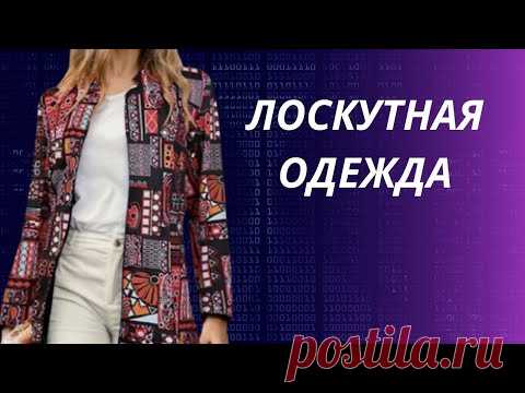 На изображении представлена женщина в ярком принтованном пиджаке с белой блузкой или топом и светлыми брюками. Фон изображения синего цвета с цифровым узором, на переднем плане крупным шрифтом написано "лоскутная одежда", что указывает на тему одежды, сделанной из отдельных кусочков ткани, стилизованной под пэчворк.