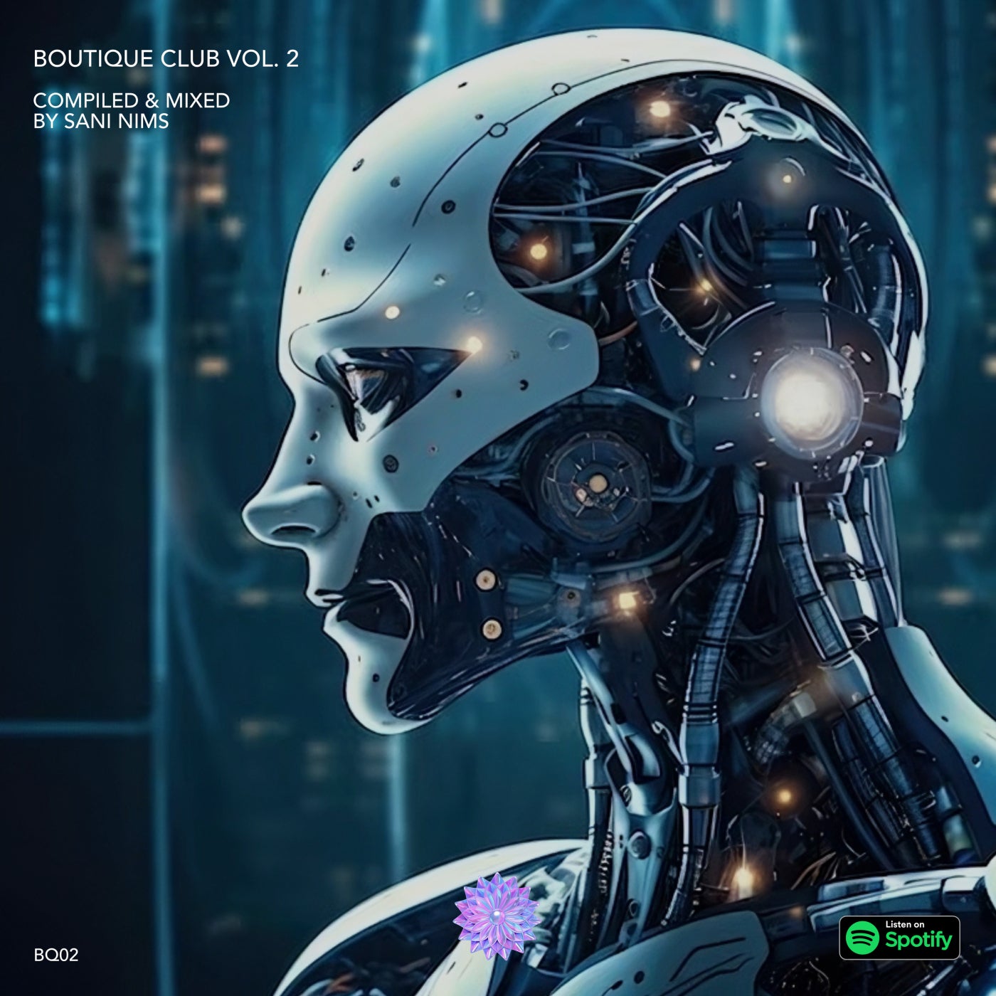 Изображение робота или андроида с человекоподобными чертами лица, с открытыми механическими элементами в голове. На обложке также указан текст: BOUTIQUE CLUB VOL. 2, COMPILED & MIXED BY SANI NIMS, с логотипом в правом нижнем углу и названием сайта postila.ru.