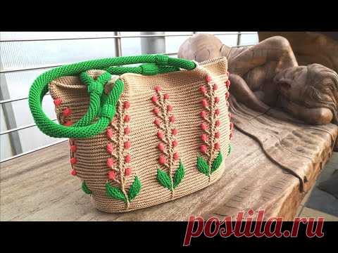 На изображении представлена женская сумка, выполненная техникой макраме. Сумка имеет коричневый оттенок с декоративными зелеными и розовыми элементами в виде листьев и веток. Она размещена на деревянной поверхности, которая, вероятно, является частью мебели или декора. В фоне видна часть интерьера или открытое пространство.