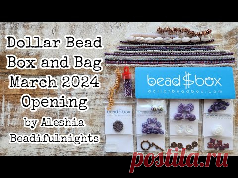 Открытие бусинной коробки и мешочка Dollar Bead Box за март 2024 года от Aleshia на beadifulnights, представленное на posilla.ru. На изображении видно бусины различных цветов и форм, упакованные в индивидуальные пакеты.