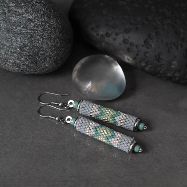 柔和的仙人掌串珠耳环 Miyuki 串珠软灰色,绿色手术钢 - Etsy China