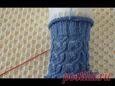 Вязаная в ручную синяя вязаная часть одежды с кабельным узором, возможно носок, на фоне вафельного полотенца.