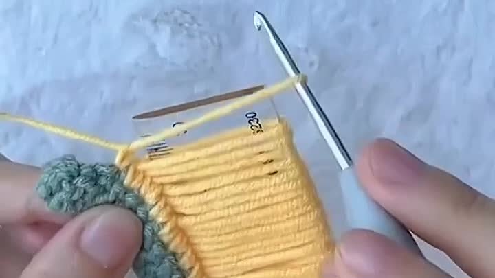 На изображении представлен процесс вязания: чьи-то руки вяжут крючком из жёлтой пряжи. Виден вязаный элемент, крючок и катушка нити.