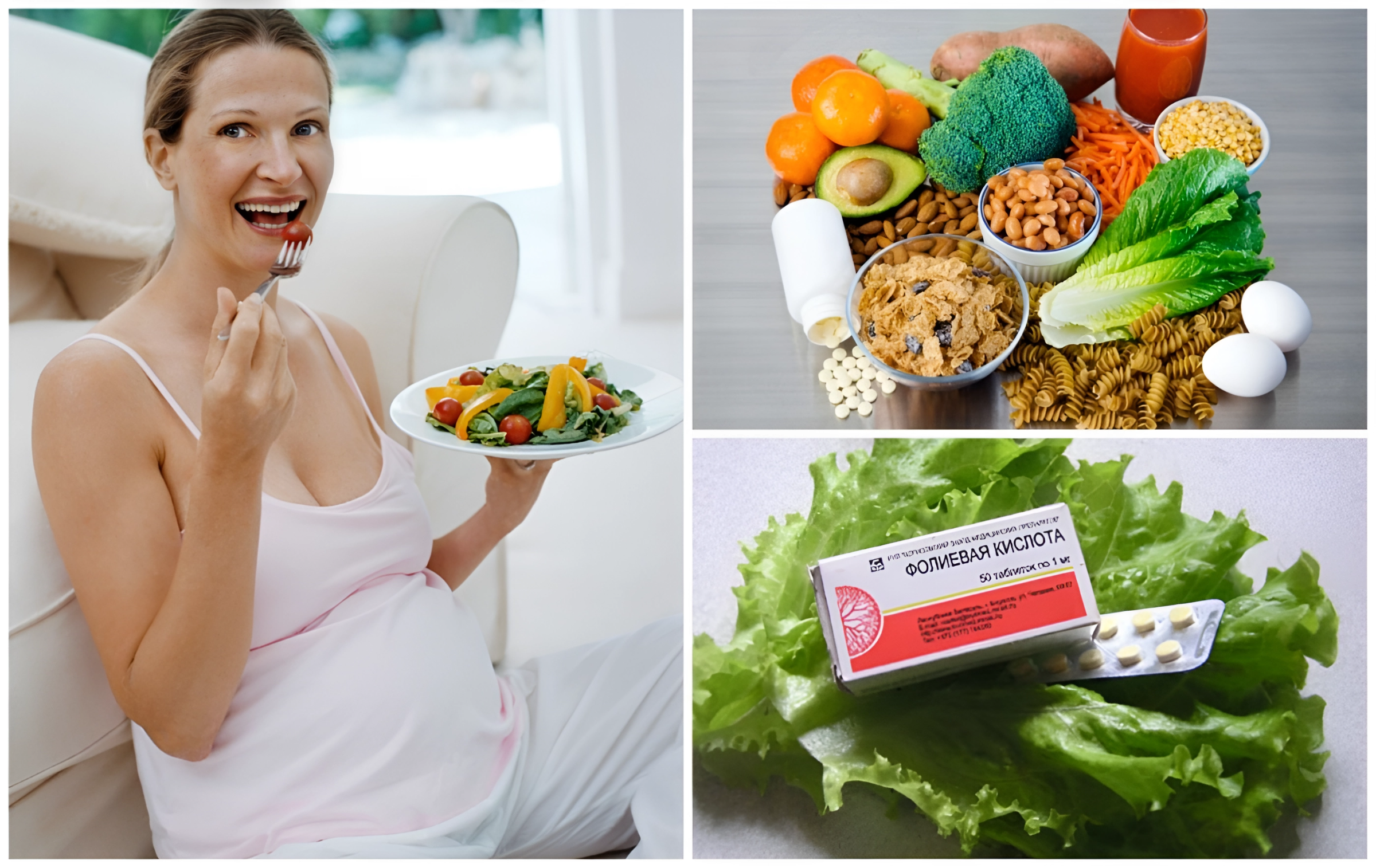 Коллаж из трех изображений. На верхнем левом изображении беременная женщина сидит на диване и ест салат, улыбаясь в камеру. Верхнее правое изображение показывает разнообразные продукты питания, такие как фрукты, овощи, орехи, яйца и сок. Нижнее изображение содержит изображение лекарственного блистера на листе салата с водяным знаком "postila.ru".