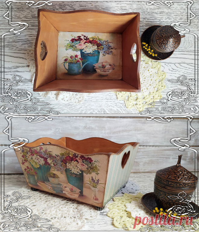 Изображение декоративного деревянного подноса с ручками, расписанного цветочными мотивами. Поднос украшен изображениями ваз, чашек и букетов цветов. На заднем фоне видна структура деревянной поверхности и декоративный шоколадный яйцо с узором, лежащее на кружевной салфетке.