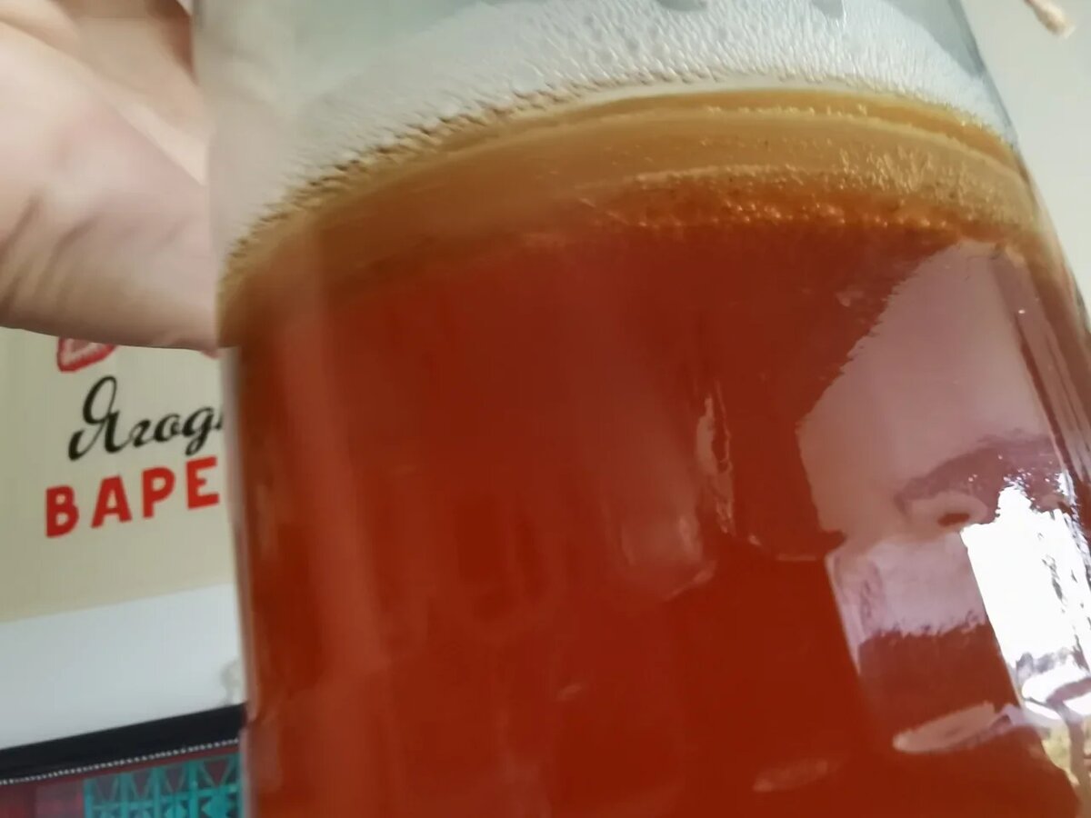 На изображении представлен крупный план кружки с пенным напитком, вероятно, пивом. В фоне размыто видно часть монитора и элементы интерьера.